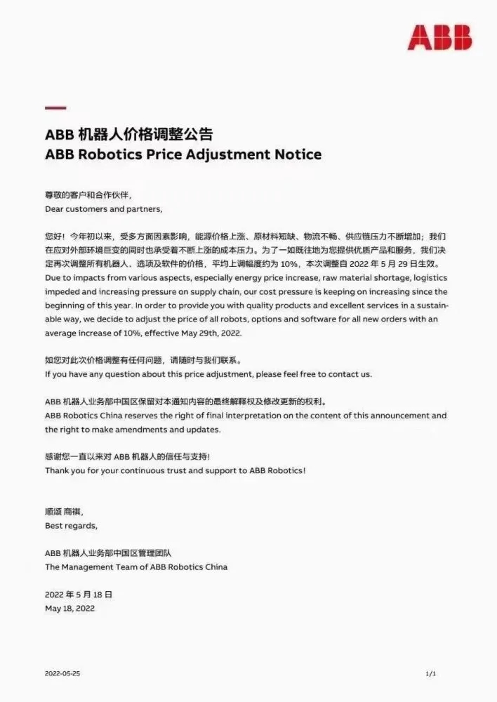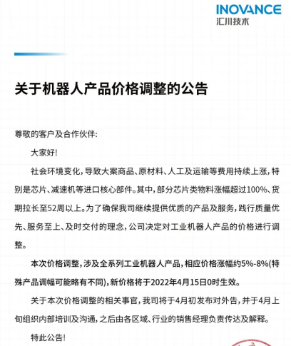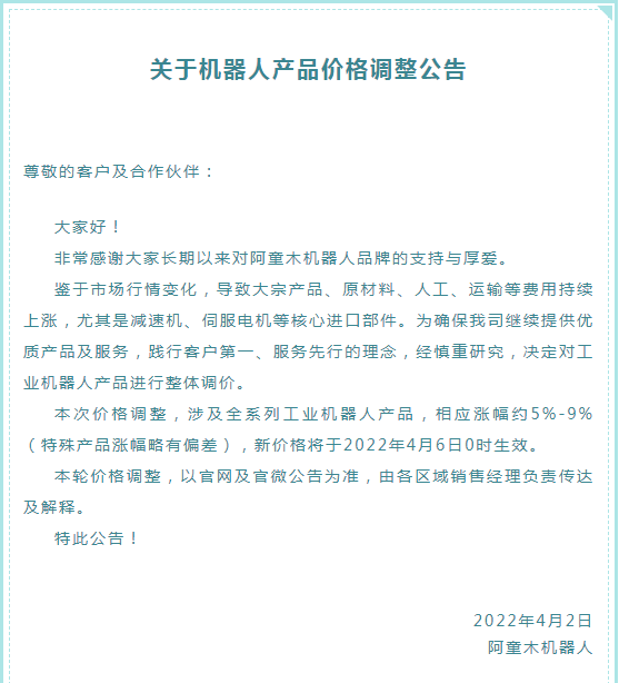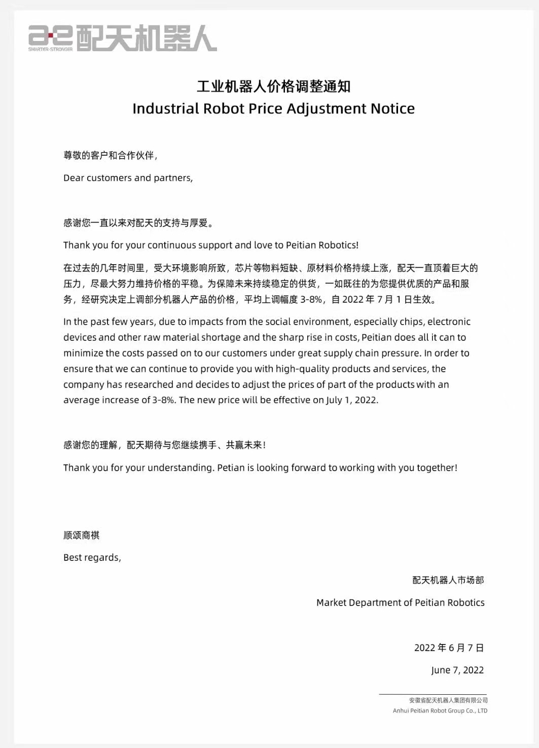 而就在本月,另一家工业机器人企业配天机器人也宣布,自2022年7月1日起,上调部分机器人产品的价格,平均上调幅度3-8%。