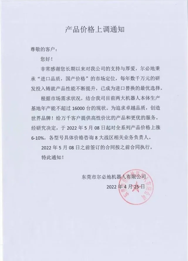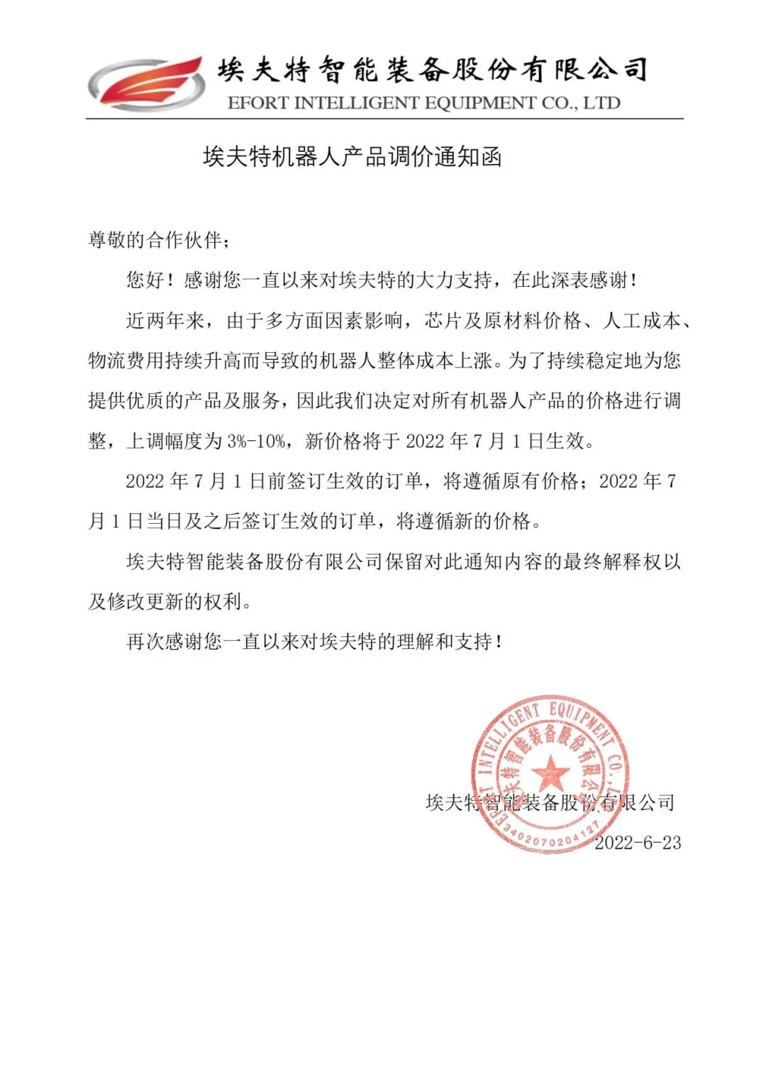 近日,国产工业机器人龙头企业埃夫特宣布,自7月1日起,对公司所有机器人产品价格上调3%-10%。