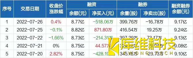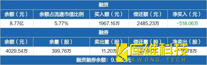 融资方面,当日融资买入1967.16万元,融资偿还2485.23万元,融资净偿还518.06万元。融券方面,融券卖出11.2万股,融券偿还27.98万股,融券余量399.76万股,融券余额4029.54万元。融资融券余额合计9.17亿元。