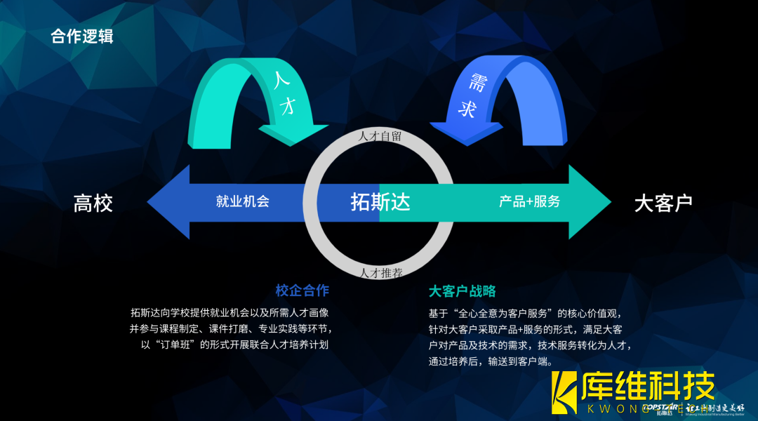 以大客户产品+服务的合作模式为例,通过客户端反馈的人才需求画像,结合与高校开展联合人才培养计划,共同打造符合客户岗位需求的人才,将技术服务转化为人才,通过产品+人才打包的方式为客户提供服务。