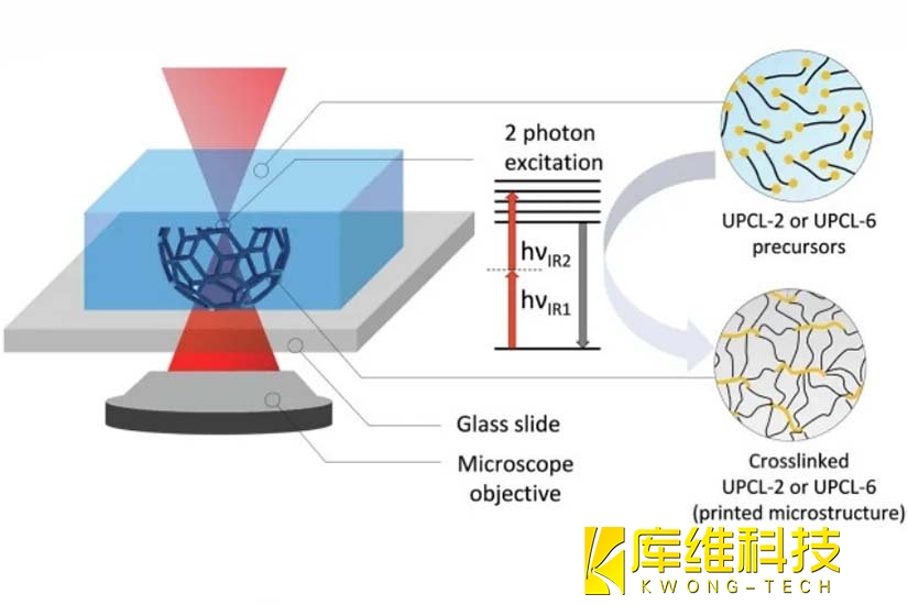 双光子聚合(2PP)是一种微纳3D打印技术,它通过飞秒脉冲激光选择性固化感光树脂,类似于光固化快速成型,但2PP 3D打印技术能以几百纳米的分辨率生产复杂的三维(3D)结构,精度远高于传统光固化成型技术。奥地利学者Aleksandr Ovsianikov就曾使用双光子聚合技术设计并合成了一种含有六官能氨基甲酸酯基遥爪聚己内酯(PCL)的材料,这种材料能满足生物医学微支架制造的需求,在组织工程领域具有巨大的应用潜力。