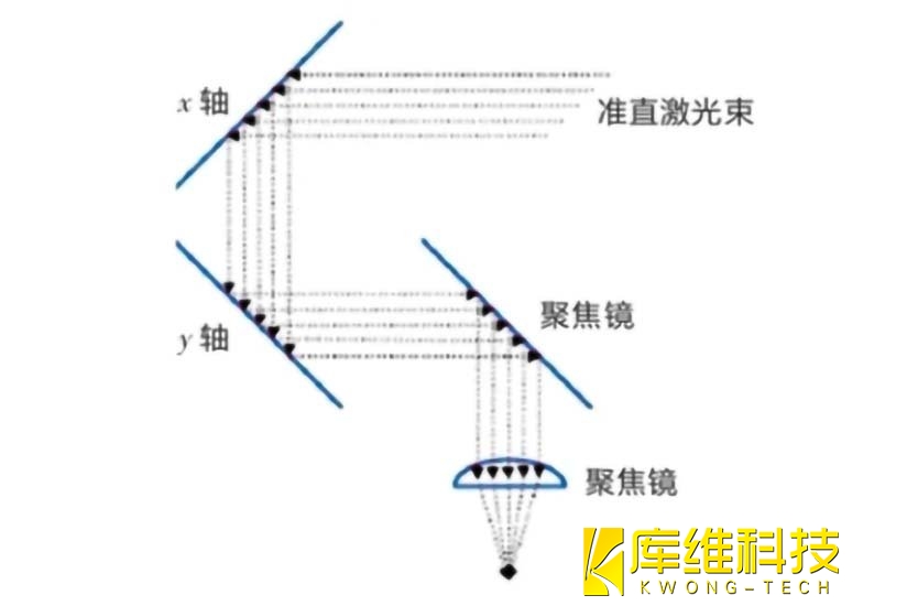 振镜焊接头的主要组成部分为扩束准直镜、聚焦透镜、XY 两轴扫描振镜、控制板卡以及上位机计算机软件系统。振镜可以改变激光光束的方向,通过电磁驱动机构带动摆动或通过步进电机驱动旋转扫描。通过振镜的运动,可以实现对光束的快速扫描,控制光斑在焊缝上高速移动,获得理想的焊缝。光束从QBH进入准直模块,转变为平行光束,再经过聚焦模块进行聚焦,以纠正激光束在聚焦平面上的枕形畸变,保证光束在同一焦平面内的精准移动。目前,实现光束摆动主要通过能够承受高功率激光的振镜实现,如图所示。
