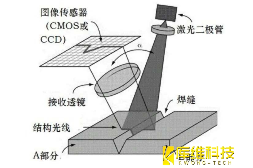 焊缝跟踪技术通常基于传感器(如激光传感器或视觉传感器)来实时采集焊缝的图像信息,然后通过图像处理和分析来识别焊缝的位置和形状。控制器根据这些信息调整执行机构(如焊接机器人的焊枪),实现对焊缝的精确跟踪。其中,激光焊缝跟踪技术利用激光三角形测量法,通过激光器发射线激光照射到工件表面,经过漫反射后,激光轮廓在CCD或CMOS传感器上成像。控制器对采集到的图像进行处理分析,获取焊缝的位置,用于修正焊接轨迹或引导焊接,如图所示。视觉图像法主要基于普通视觉的焊缝跟踪使用光学摄像头或工业相机对焊缝进行拍摄,获取焊缝的图像信息,然后利用图像处理算法对图像进行分析和处理,提取出焊缝的位置和形状信息。