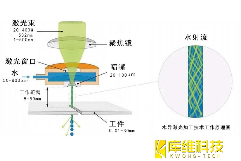 原理:利用激光通过压力调制的水腔,将激光束聚焦在喷嘴上,形成光波导,从而引导激光切割。