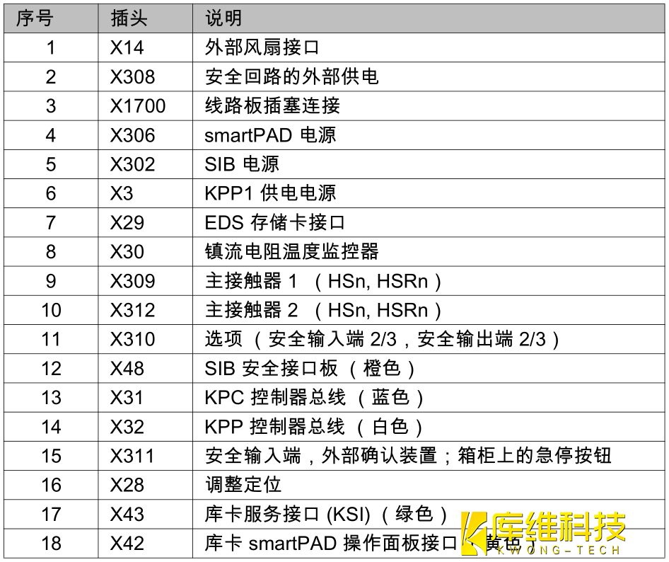 控制柜 (CCU)包含两块电路板 (CIB 控制柜接口板和 PMB 电源管理板),是机器人控制系统所有组件的配电装置和通讯接口. 所有数据通过内部通讯传输给控制系统,并在那里继续处理. 当电源断电时,
