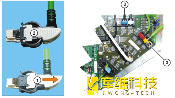 1. 关闭控制系统并采取确安措施防止未经授权的重启2. 将数据线插头解锁拔出控制柜 (CCU ) 上的所有接线解锁数据线插头如下图