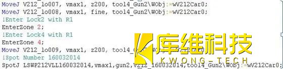 比如说:在机器人走到某一点的时候,有可能和其他机器人发生干涉,那在这个点的前一点或更前面的点,就要提前给出提示,用备注行的形式,写出会与哪个机器人发生干涉,如上图的: !enter lock with R1。但是EnterZone2这个就不需要写了,因为这个是后续和PLC交换信息时候才会用到,前期程序导入,机器人会认不到这个命令而报错。